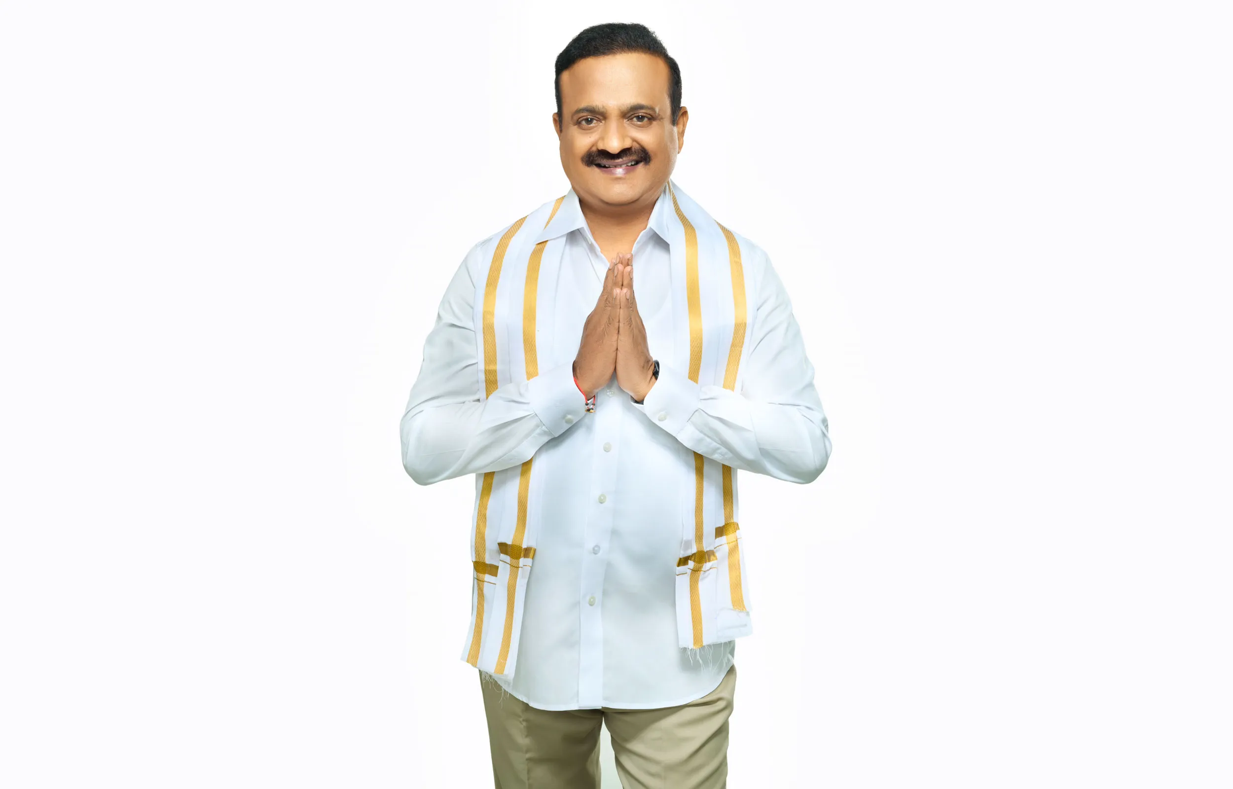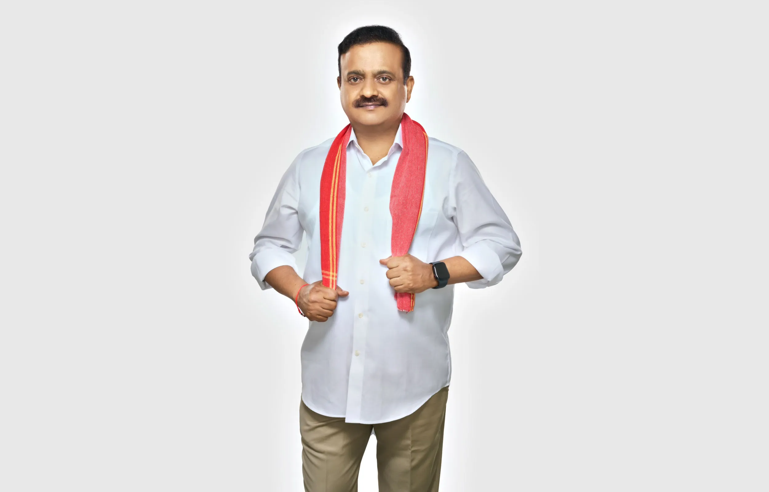 A high-impact political party promotional shoot for MP Vallabhaneni Balashowry, shot in our studio floor, with a focus on projecting his persona as a people's representative. These images are used for political campaigns, print materials, digital media, press releases, public appearances, election campaigns, party communications, national media & branding.